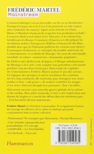 Mainstream : Enquête sur la guerre globale de la culture et des médias que votre liste de lecture ou vous serez regretter parce que vous ne l'avez pas lu encore dans votre vie.Rang parmi les ventes Amazon: #58878 dans LivresPublié le: 2011-05-15Sorti le: 2011-05-15Langue d'origine: FrançaisNombre d'articles: 1Dimensions: 4.25" h x 1.18" l x 7.01" L, Reliure: Poche581 pagesPrésentation de l'éditeurComment fabrique-t-on un best-seller, un hit ou un blockbuster ? Pourquoi le pop-corn et le Coca-Cola jouent-ils un rôle majeur dans l'industrie du cinéma ? Après avoir échoué en Chine, Disney et Murdoch réussiront-ils à exporter leur production en Inde ? Comment Bollywood séduit-il les Africains, et les telenovelas brésiliennes les Russes ? Comment Al Jazeera a-t-elle préparé les révolutions arabes ? Pourquoi les Wallons réclament-ils des filets doublés alors que les Flamands préfèrent les versions sous-titrées ? Et pourquoi, finalement, ce triomphe du modèle américain de l'" entertainment " et ce déclin de l'Europe ? Au coeur de cette bataille mondiale : la culture " mainstream " (dominante, populaire). De Hollywood à Bollywood, du Japon à l'Afrique subsaharienne, du Mexique à la Corée, cette enquête sans précédent a été menée pendant cinq ans dans trente pays. Dans toutes les capitales de l'entertainment, Frédéric Martel analyse le jeu des acteurs, les logiques des groupes et suit la circulation des contenus sur les cinq continents. De nouveaux pays émergent avec leurs médias et leur " soft power ", ils veulent contrôler les images et les rêves. Internet décuple leur puissance. Tout s'accélère. Mainstream raconte cette nouvelle guerre globale de la culture et des médias. Best-seller inattendu, le livre a été traduit dans une dizaine de langues et a suscité des débats dans de nombreux pays - il est lui-même devenu mainstream.Biographie de l'auteurFrédéric Martel est chercheur et journaliste. Il est également l'auteur de l'ouvrage de référence De la culture en Amérique qui paraît conjointement dans la même collection.Vous trouverez ci-dessous quelques critiques les plus utiles sur Mainstream : Enquête sur la guerre globale de la culture et des médias. Vous pouvez considérer cela avant de décider d'acheter / lire ce livre.