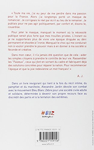 Laissez-nous faire ! Alexandre JARDIN pdf english - 206pages. 21x14x2cm. Broché.Rang parmi les ventes Amazon: #182435 dans LivresPublié le: 2015-04-16Sorti le: 2015-04-16Langue d'origine: FrançaisNombre d'articles: 1Dimensions: 8.50" h x .79" l x 5.35" L, Reliure: Broché216 pagesPrésentation de l'éditeur" Toute ma vie, j'ai eu peur de me perdre dans ma passion pour la France. Alors j'ai longtemps porté un masque de romancier. Je corrigeais le réel par écrit au lieu de le remanier. Je publiais pour ne pas agir politiquement, par confort et, disons-le, couardise. Pour jeter le masque, manquait le moment où la nécessité publique serait plus forte que mes trouilles privées. L'instant où je ne supporterais plus de vivre une époque droguée au déni permanent et shootée à l'ironie. Manquait le choc qui me conduirait non à vouloir prendre le pouvoir mais à en donner à ma société si féconde et créative. Dans mon cœur, il n'a jamais été question que de cela : aider les simples citoyens à prendre le contrôle de leur vie. Rassembler les "Faizeux', ceux qui font en sortant du cadre et fabriquent déjà des solutions concrètes pour réparer la nation. Pour recommencer l'époque et que la joie redevienne un mot français ! " A.J.Dans un livre revigorant qui tient à la fois du récit intime, du pamphlet et du manifeste, Alexandre Jardin dévoile son combat avec le mouvement Bleu Blanc Zèbre pour une société civile adulte et solidaire, déterminée à devenir son propre recours face au discrédit des partis et à la tentation des extrêmes.Biographie de l'auteurRomancier, mais aussi scénariste et réalisateur, Alexandre Jardin, de Bille en tête à Juste une fois, a publié plus d'une vingtaine de romans et récits qui ont fait de lui l'un des auteurs de fiction français les plus lus. Il a également écrit des ouvrages pour la jeunesse, et, en 2002, un essai précurseur de cet ouvrage : 1 + 1 + 1 = une révolution (80 000 exemplaires vendus). Il est engagé depuis quinze ans dans un combat de militant associatif auquel il se livre aujourd'hui pleinement.